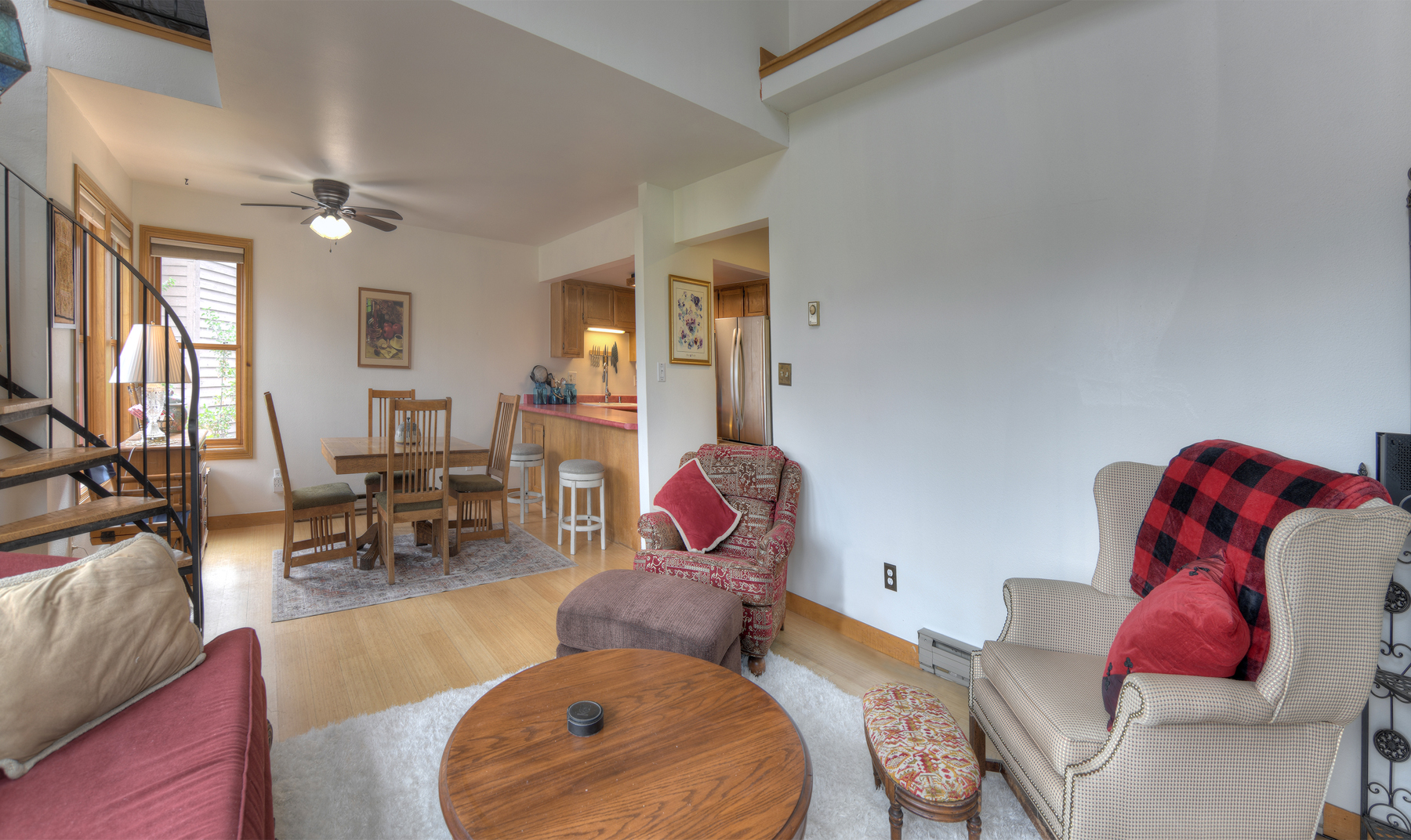 Step inside this inviting retreat featuring an open-concept living area with a flat-screen TV and cozy wood-burning fireplace—perfect for relaxing after a day of exploring. The fully equipped kitchen and adjacent dining area make it easy to enjoy meals together. Upstairs, a charming spiral staircase leads to the loft—ideal for extra guests or a quiet reading nook.