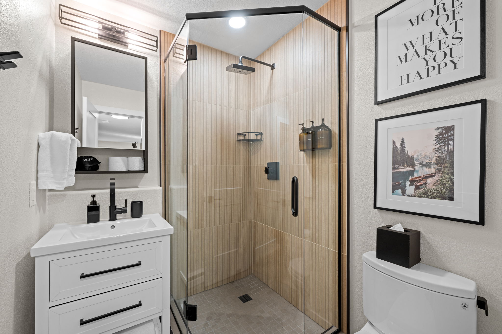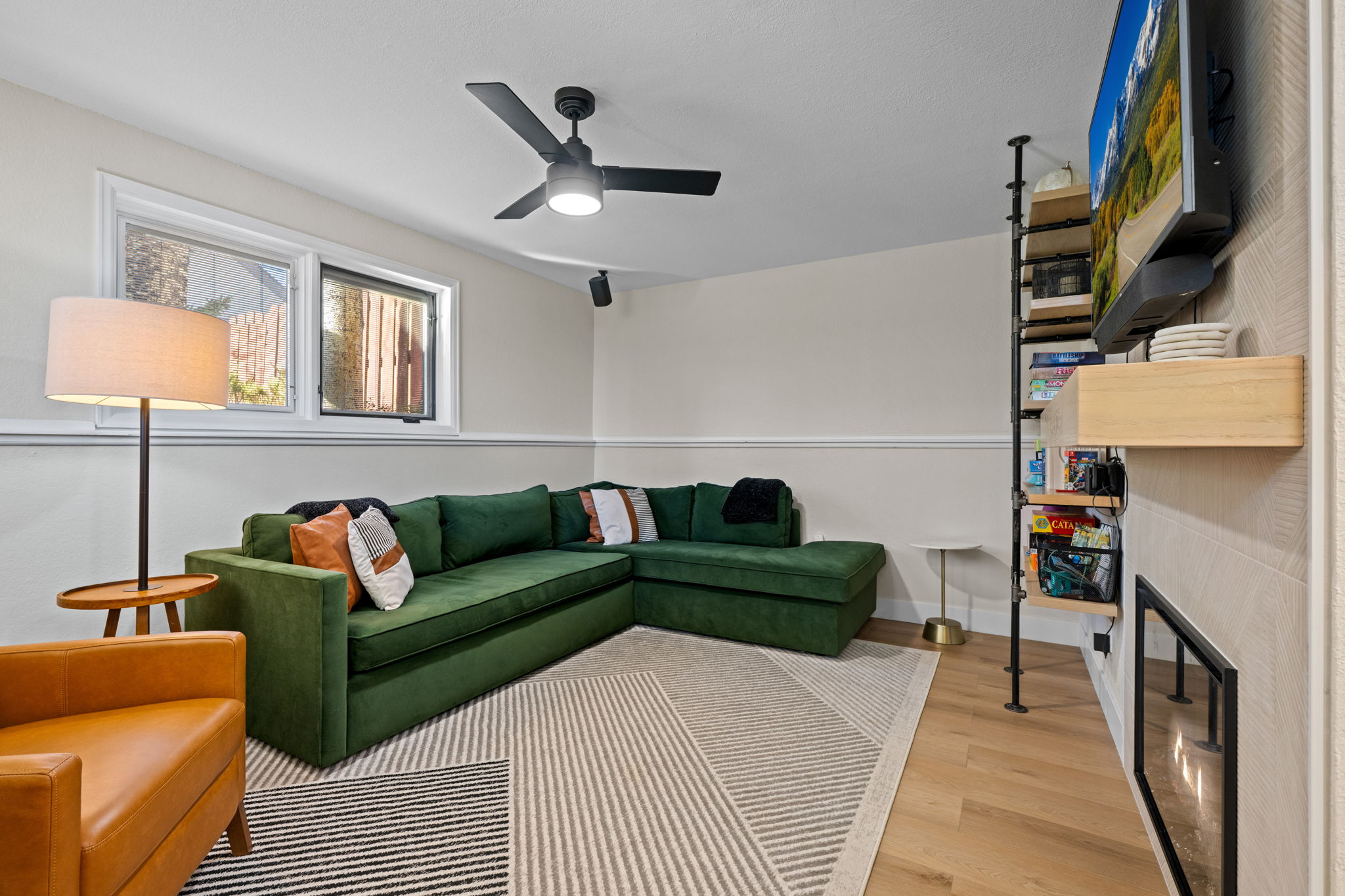 Inside, two spacious levels are designed for comfort and connection. The main level features a bright dining area, a modern fully equipped kitchen for gourmet meals, and a welcoming entryway. Downstairs, the expansive living room is perfect for movie nights or cozy gatherings, with a comfortable bedroom and full bathroom nearby for added convenience.
