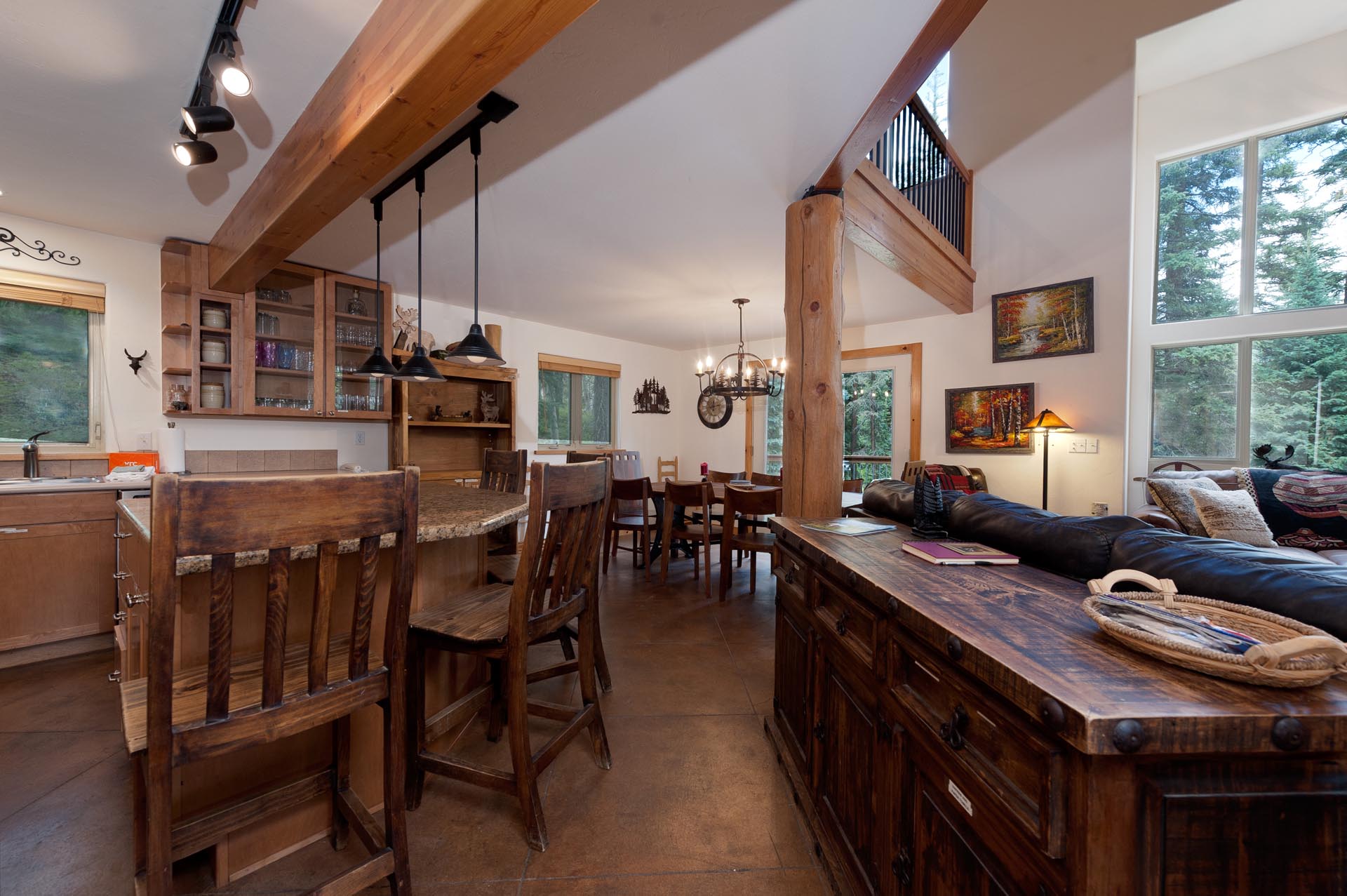 The main living space includes a wood fireplace (wood provided), cathedral ceilings and an open floor plan and and the residence features super fast Starlink WIFI.