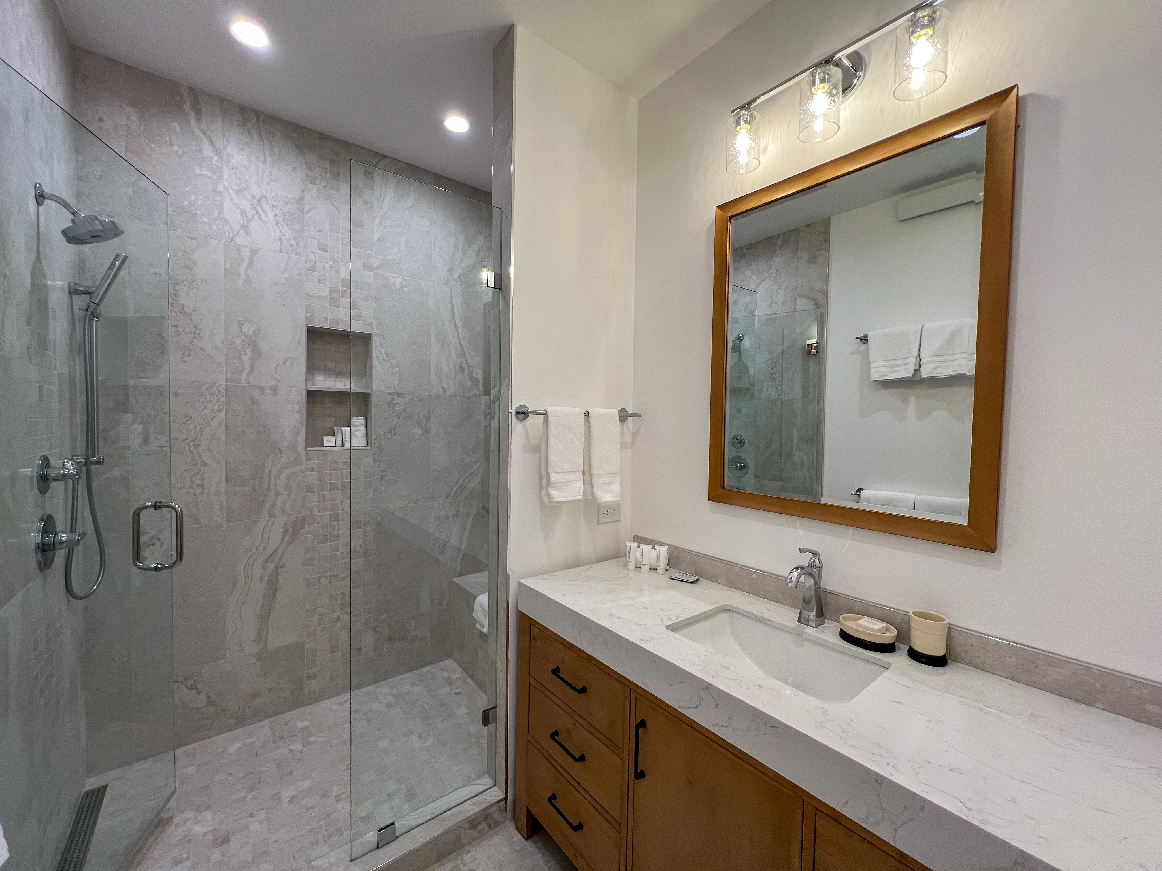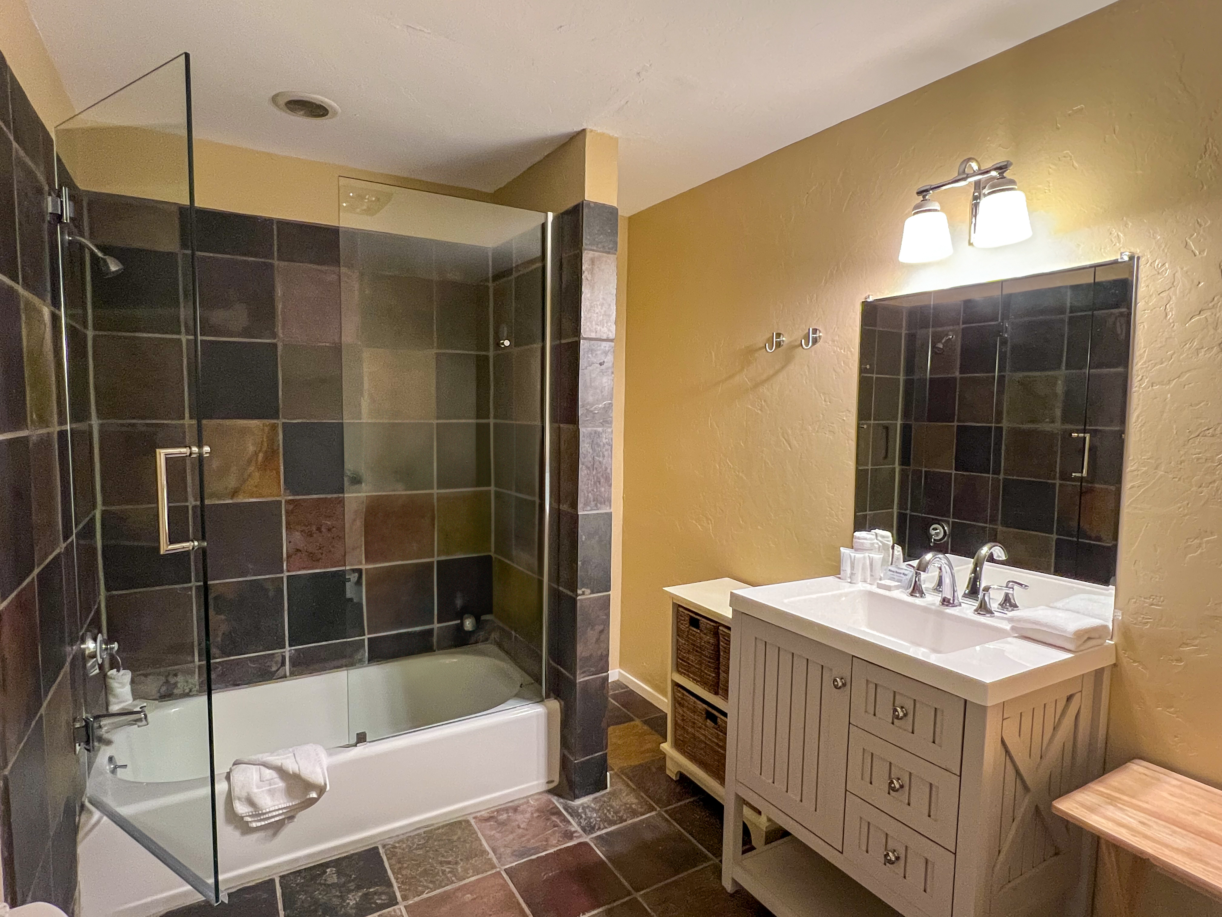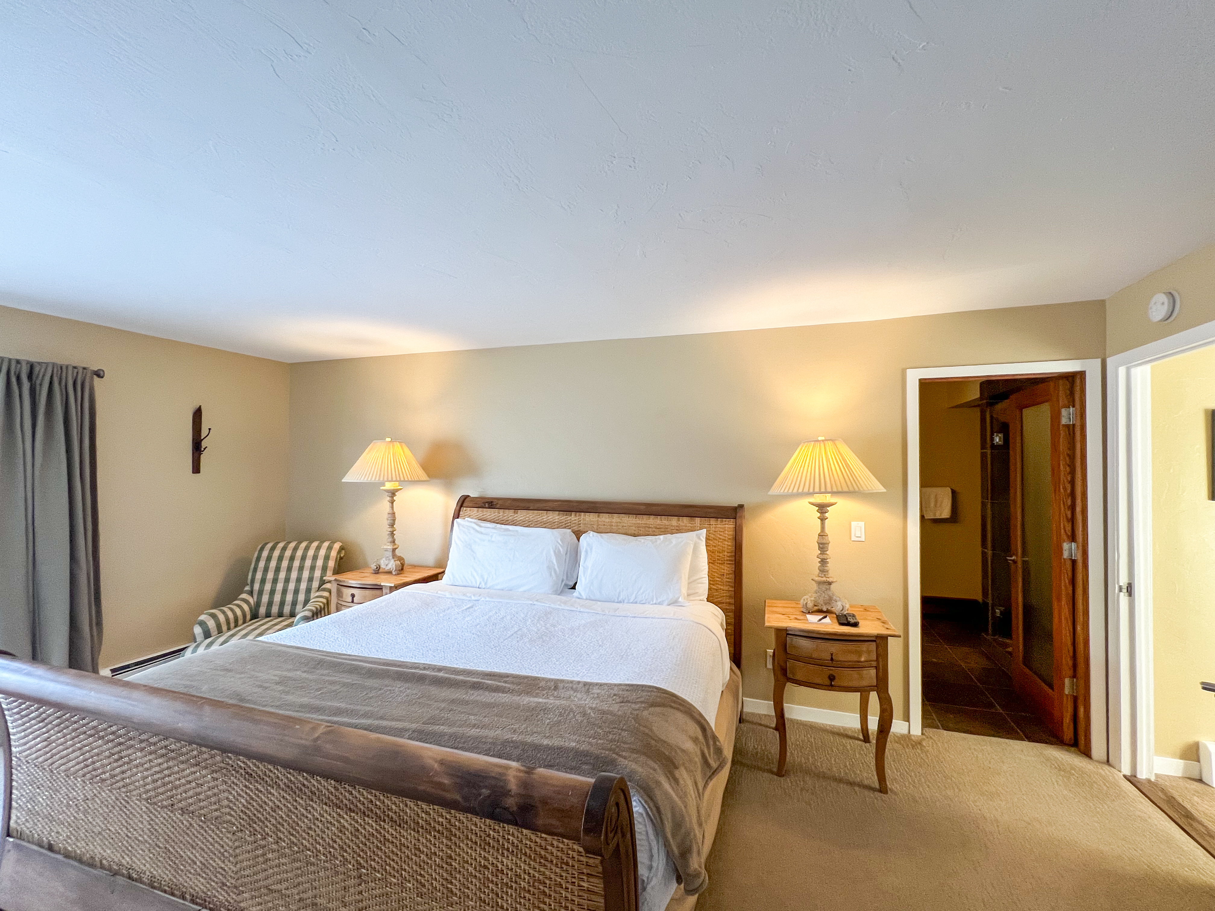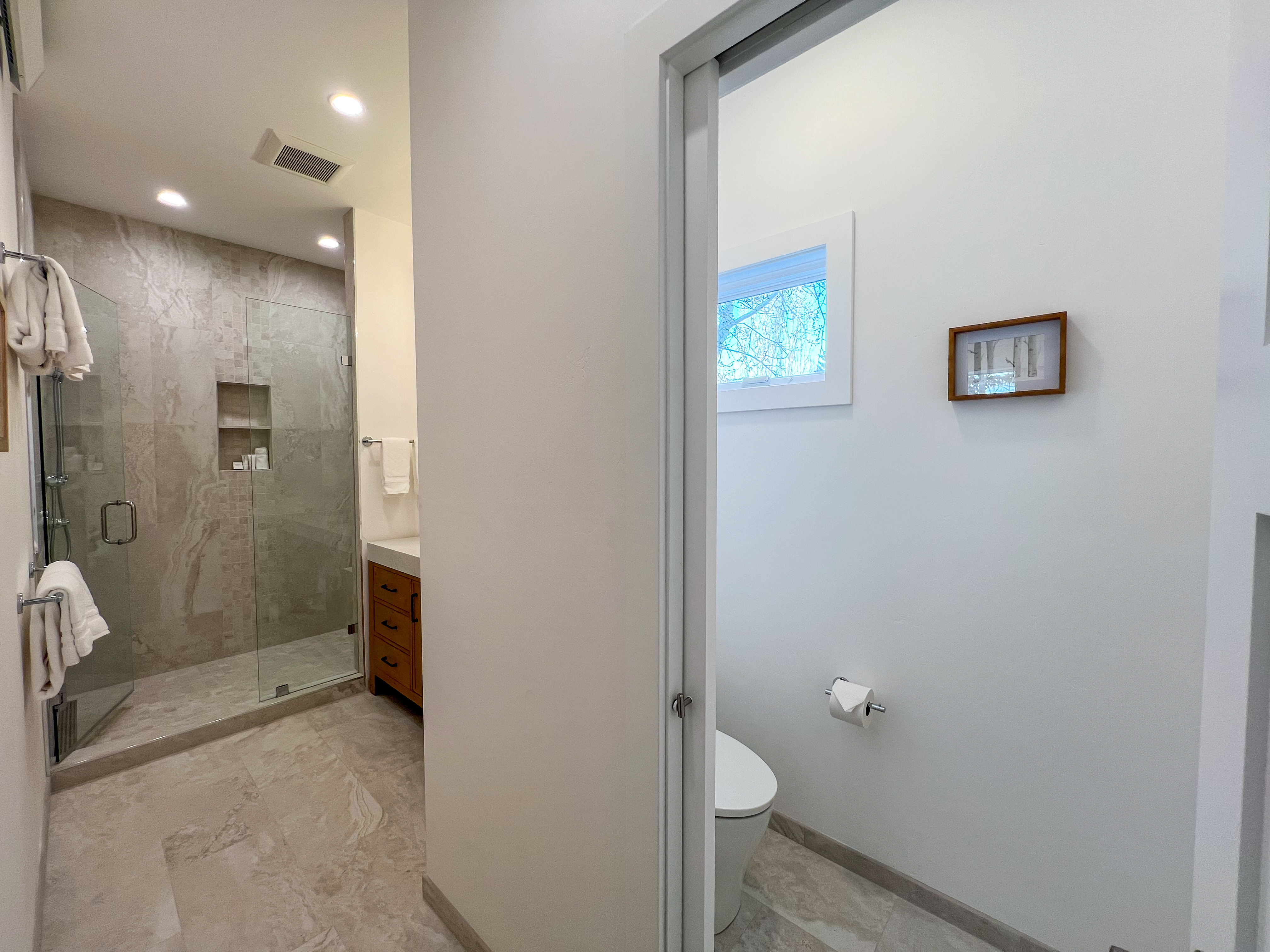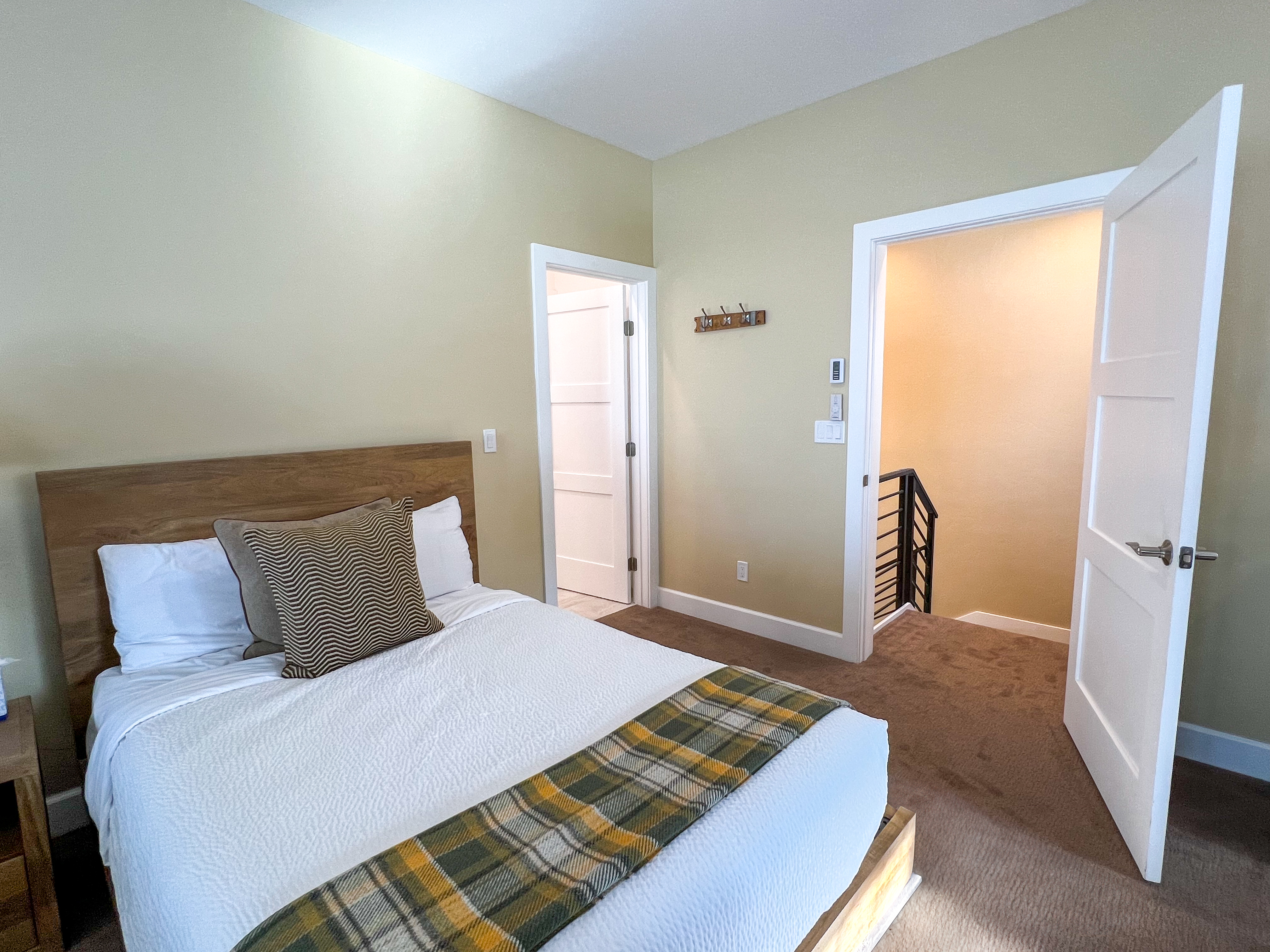 Bedroom 1: King Bed with Smart TV (Lower Level) + Ensuite Bathroom (Soaking tub & walk-in shower)
