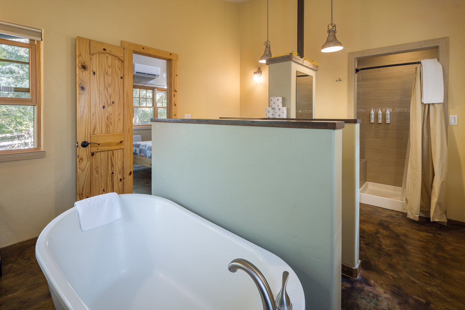 Step inside to find a bright, thoughtfully designed studio that combines functionality with comfort. The inviting king bed, cozy seating area, and private ensuite bathroom with a walk-in shower and soaking tub make relaxation effortless after a day outdoors. A compact kitchenette includes an under-counter refrigerator, microwave, sink, and coffee maker - everything you need for simple meals or your morning brew before hitting the trails.