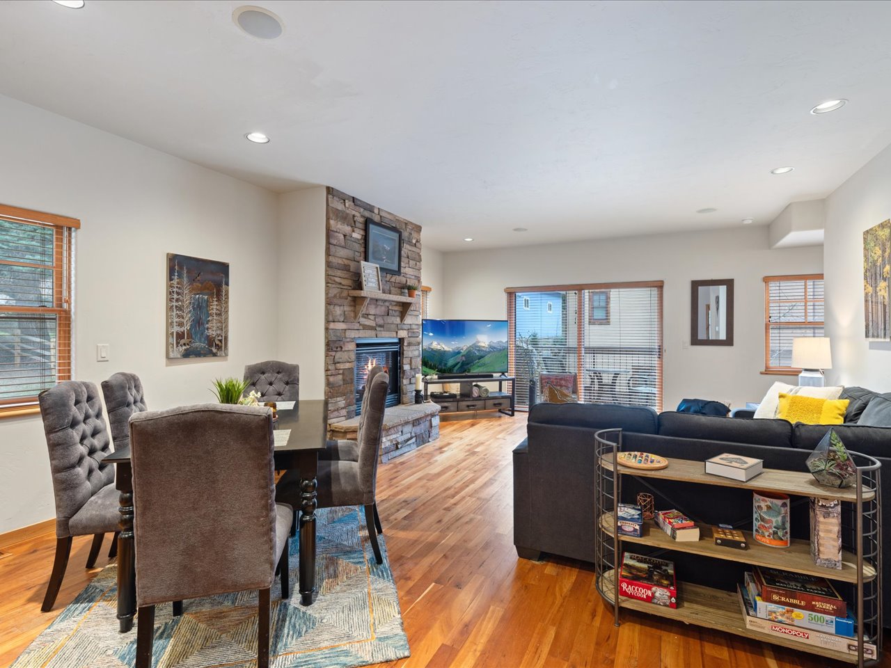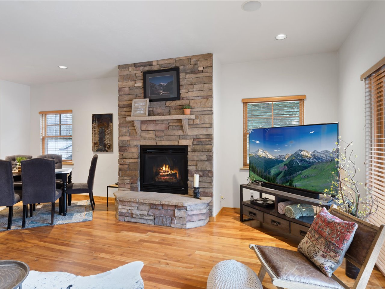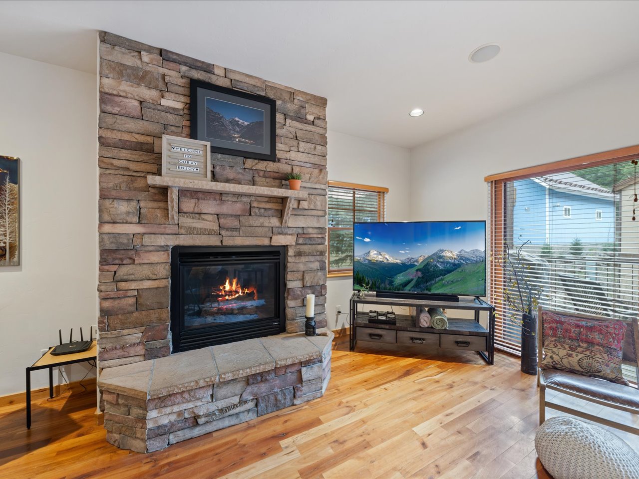 • Cozy living room with stone fireplace & Smart TV