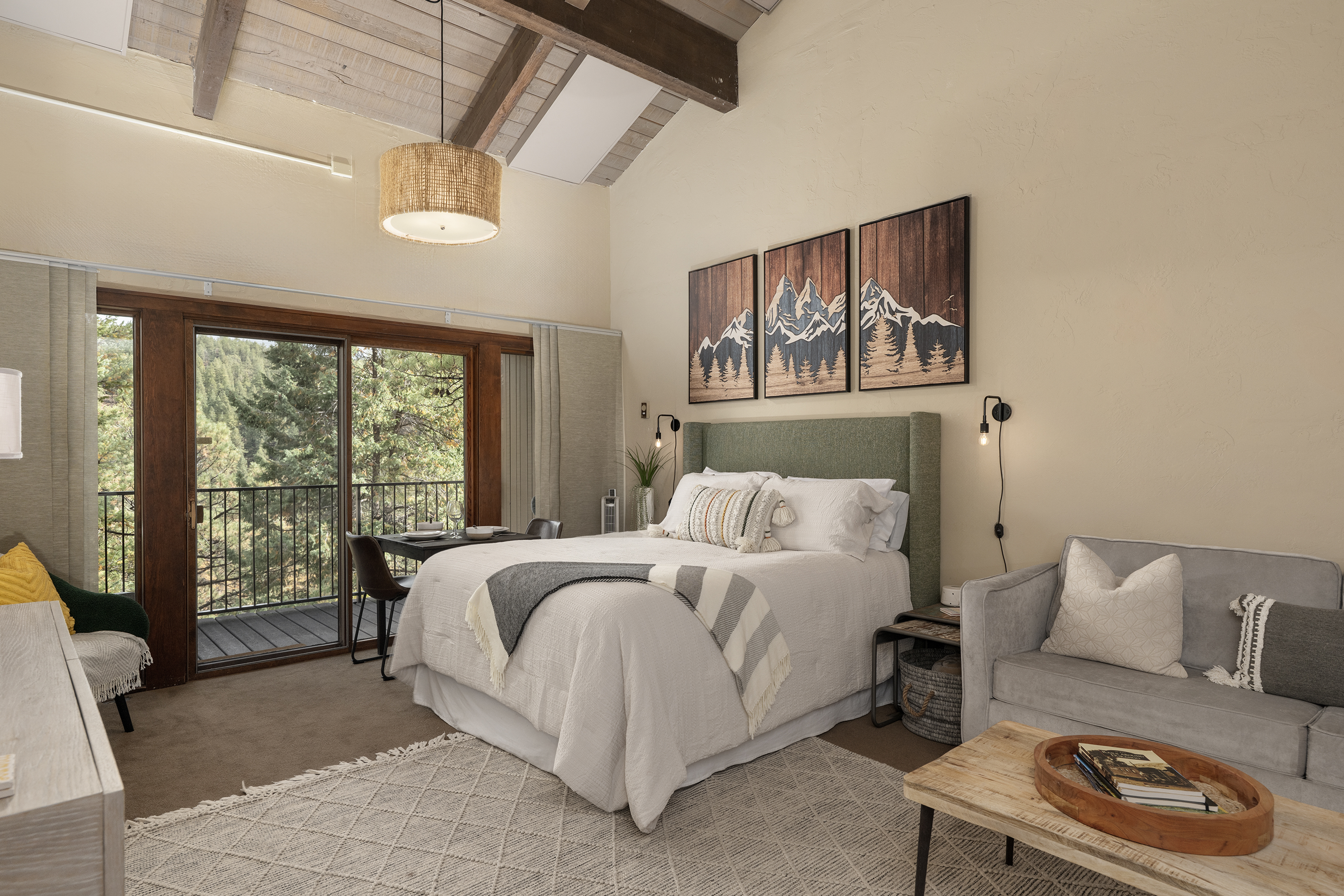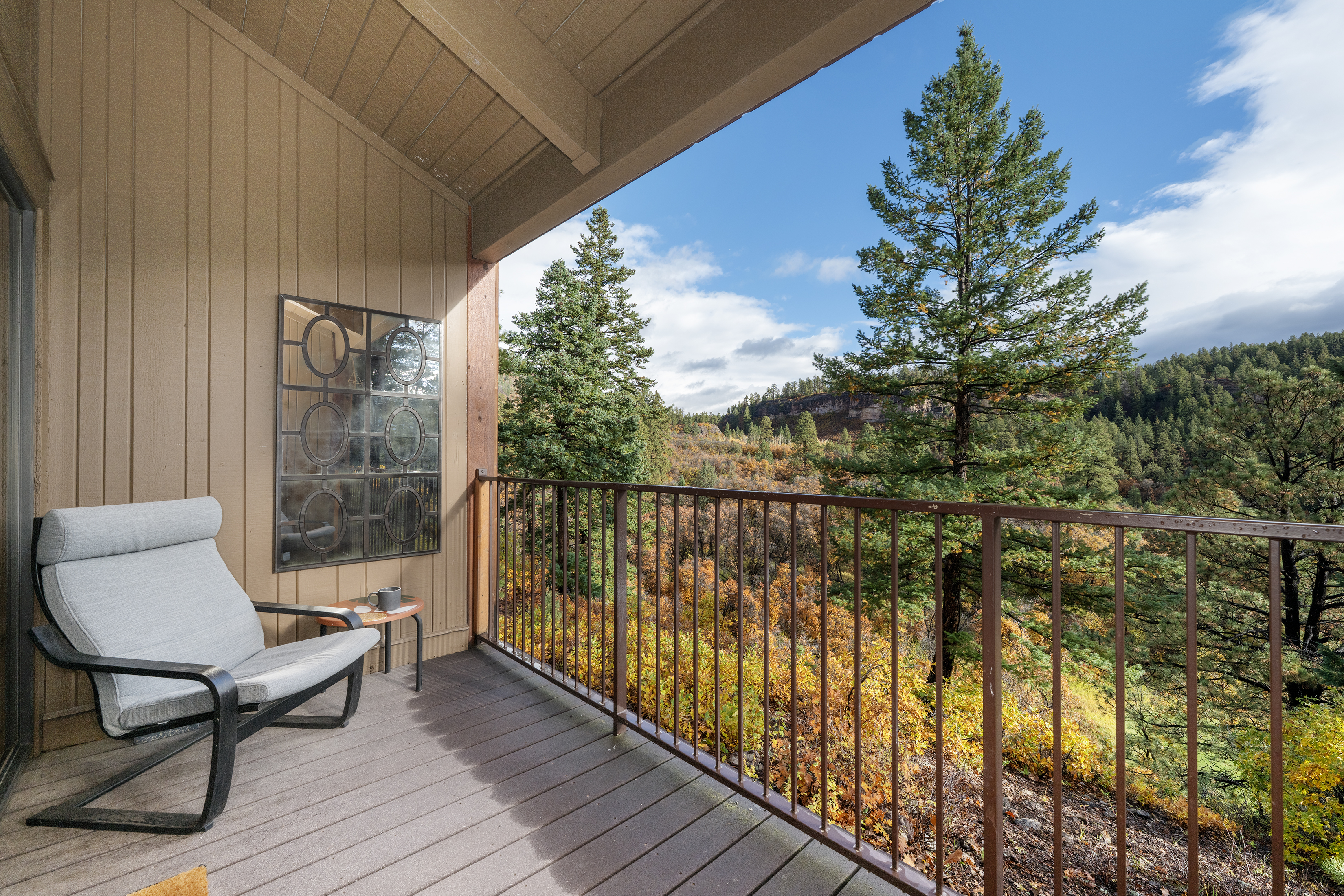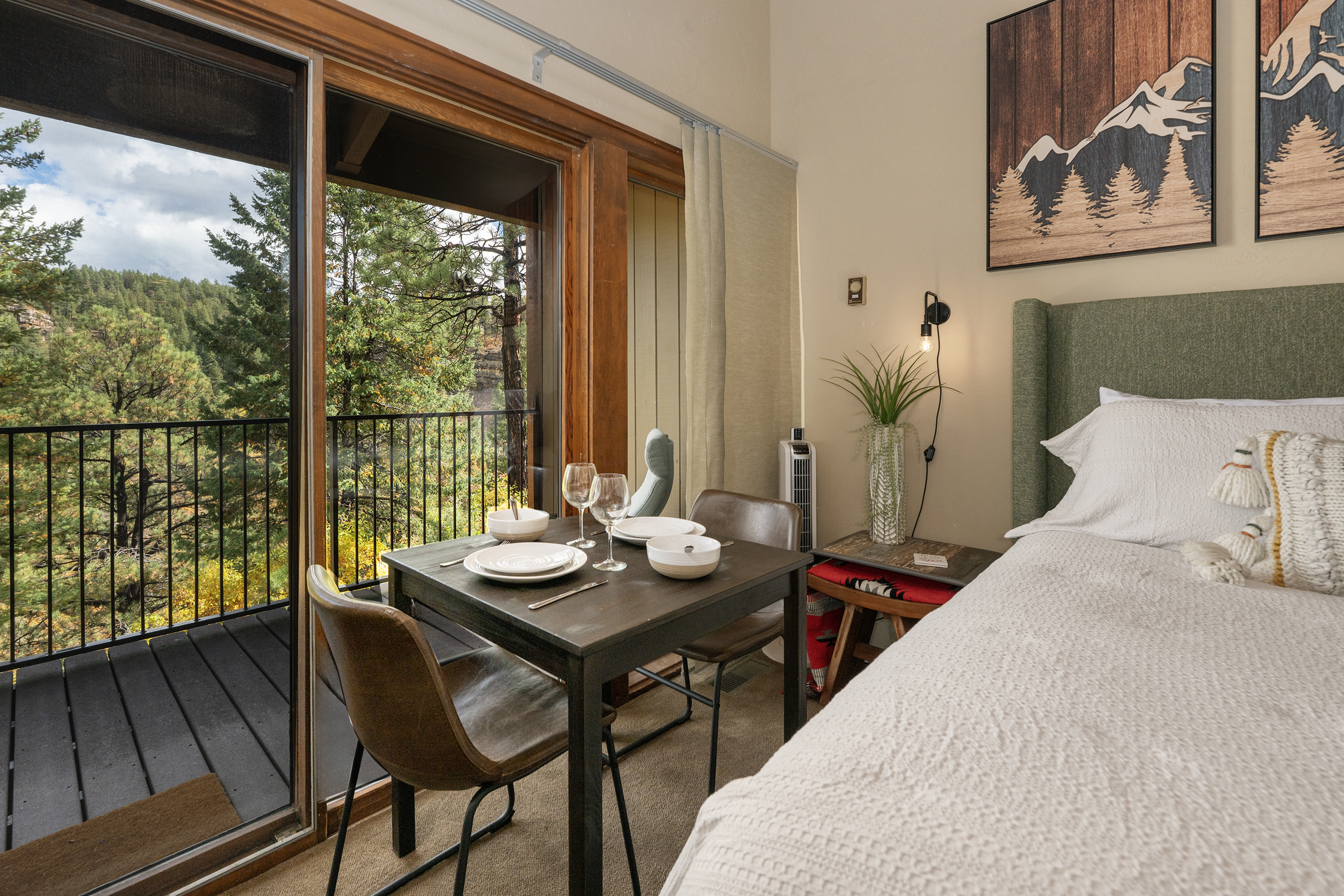 Queen bed, full kitchen with large fridge and stove/oven, dishwasher, microwave, toaster and regulard and keurig coffee pot. New queen sleeper sofa. There are comfortable chairs on the deck facing east views of pine trees, red cliffs, and a little bit of the golf course. Large flat screen TV with Roku.