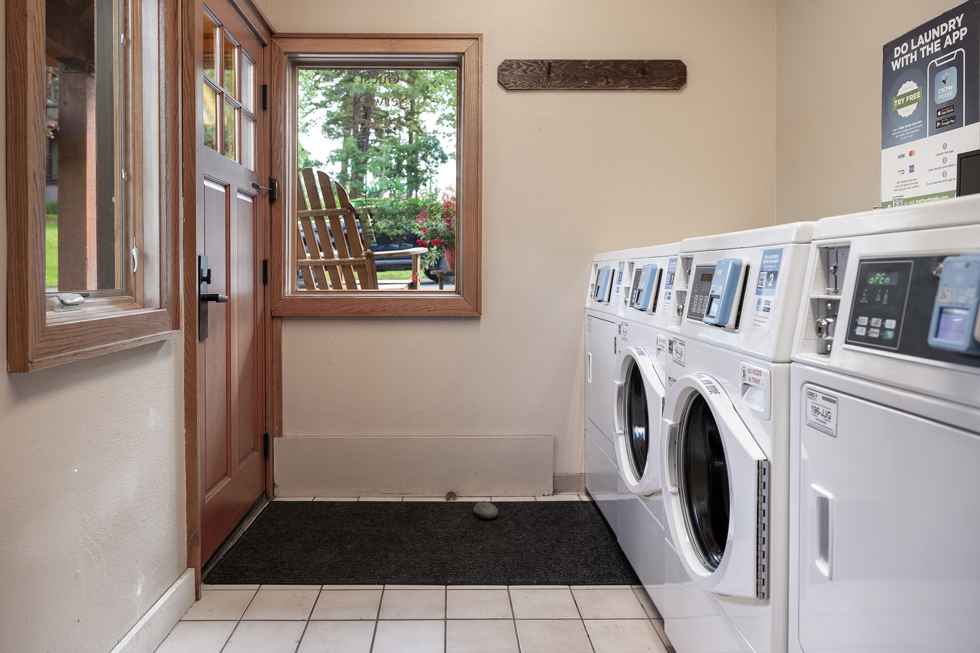 Coin laundry in the guest service building in the center of the HighPoint parking lot.